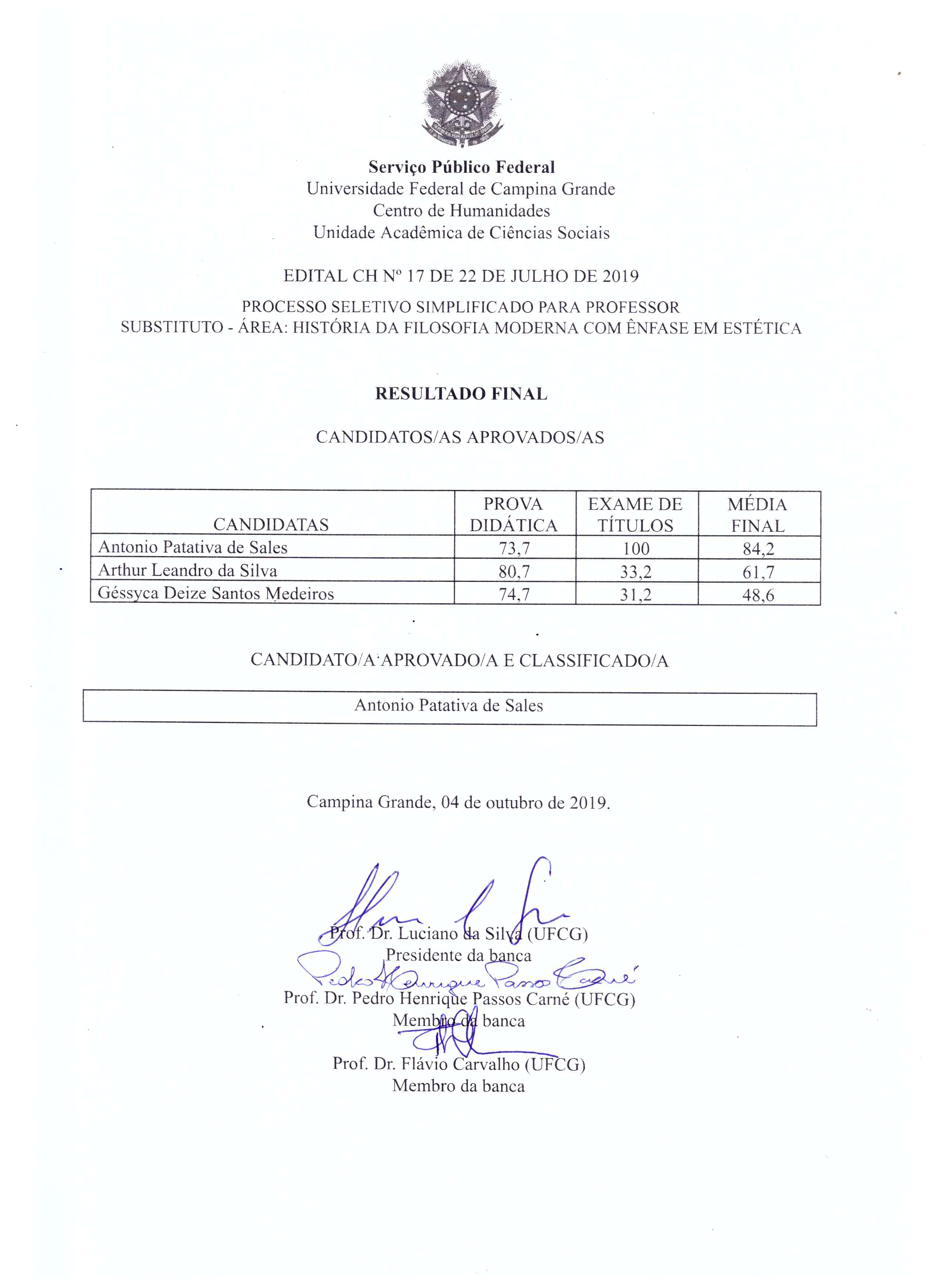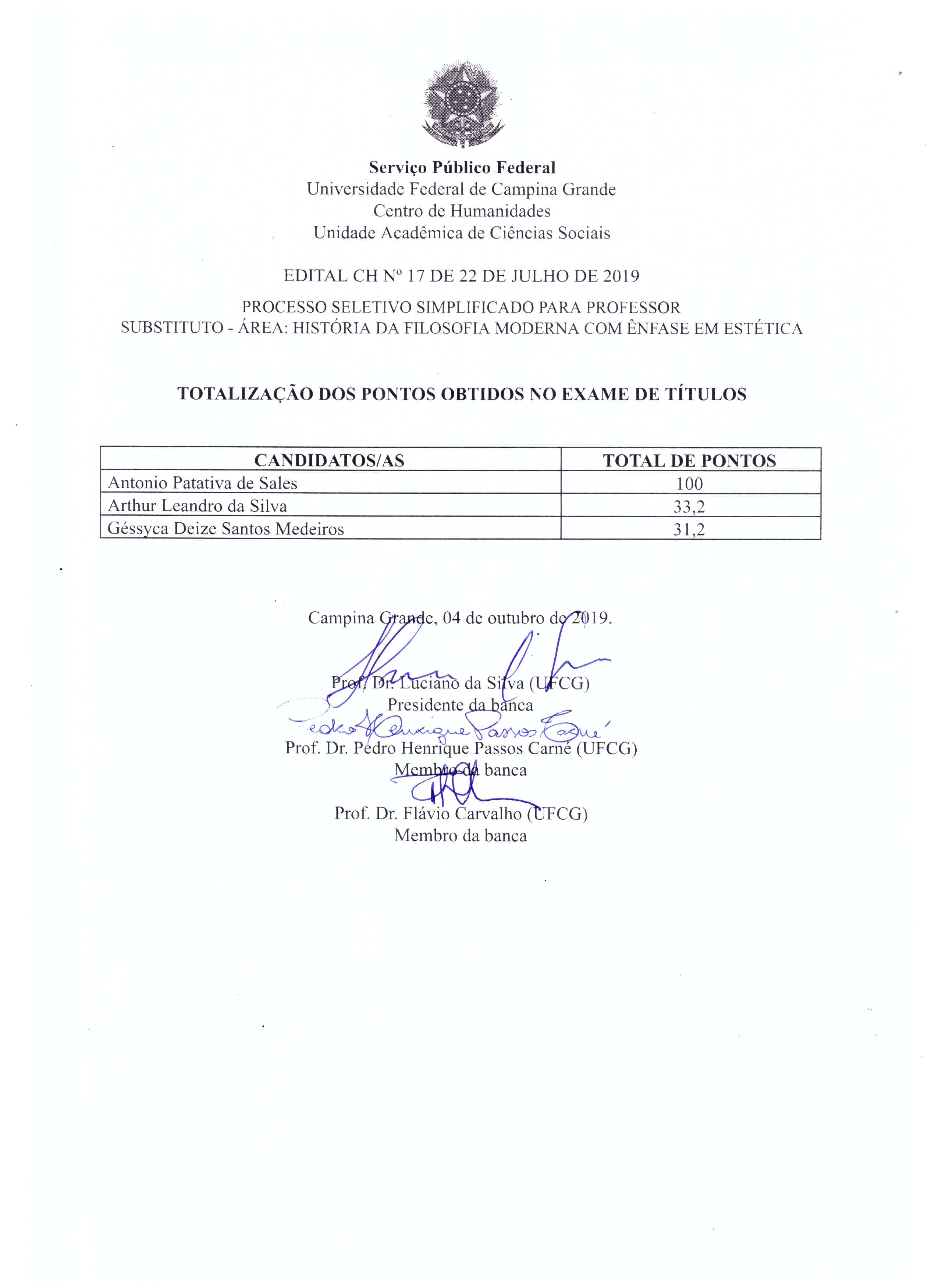 UACS - Edital CH Nº 17, 22/07/2019 - Seleção para Professor Substituto de Filosofia - Totalização da Prova de Títulos e Resultado Final