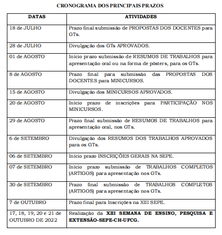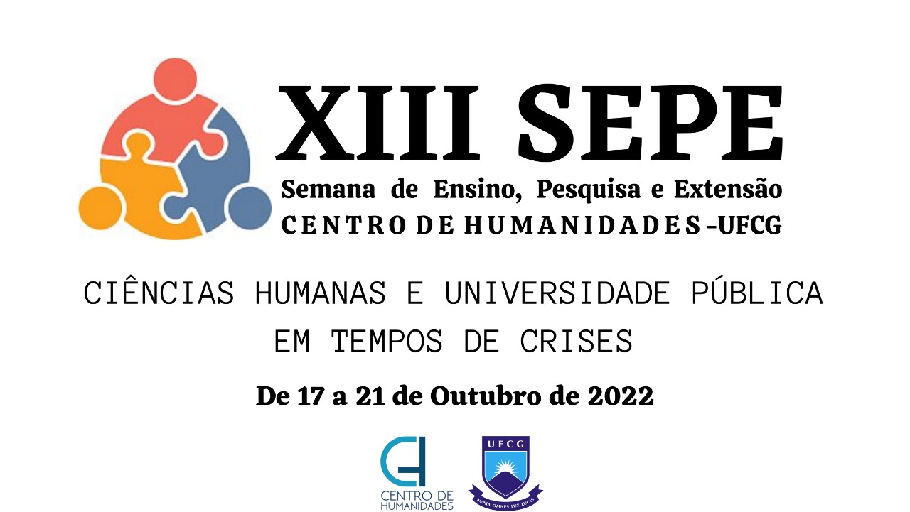 Diante deste contexto, estamos organizando a XIII Semana de Ensino, Pesquisa e Extensão-SEPE do Centro de Humanidades da UFCG, com o objetivo principal de discutir as Ciências Humanas e Universidade Pública em tempos de crises. Desta forma, pretendemos reunir docentes, discentes da Graduação e da Pós-Graduação, técnicos administrativos e comunidade acadêmica em geral, de Campina Grande e região, através da organização de Conferências, Mesas Redondas, Minicursos, Grupos de Trabalho, Atividades Artísticas e Exposições de Trabalhos.